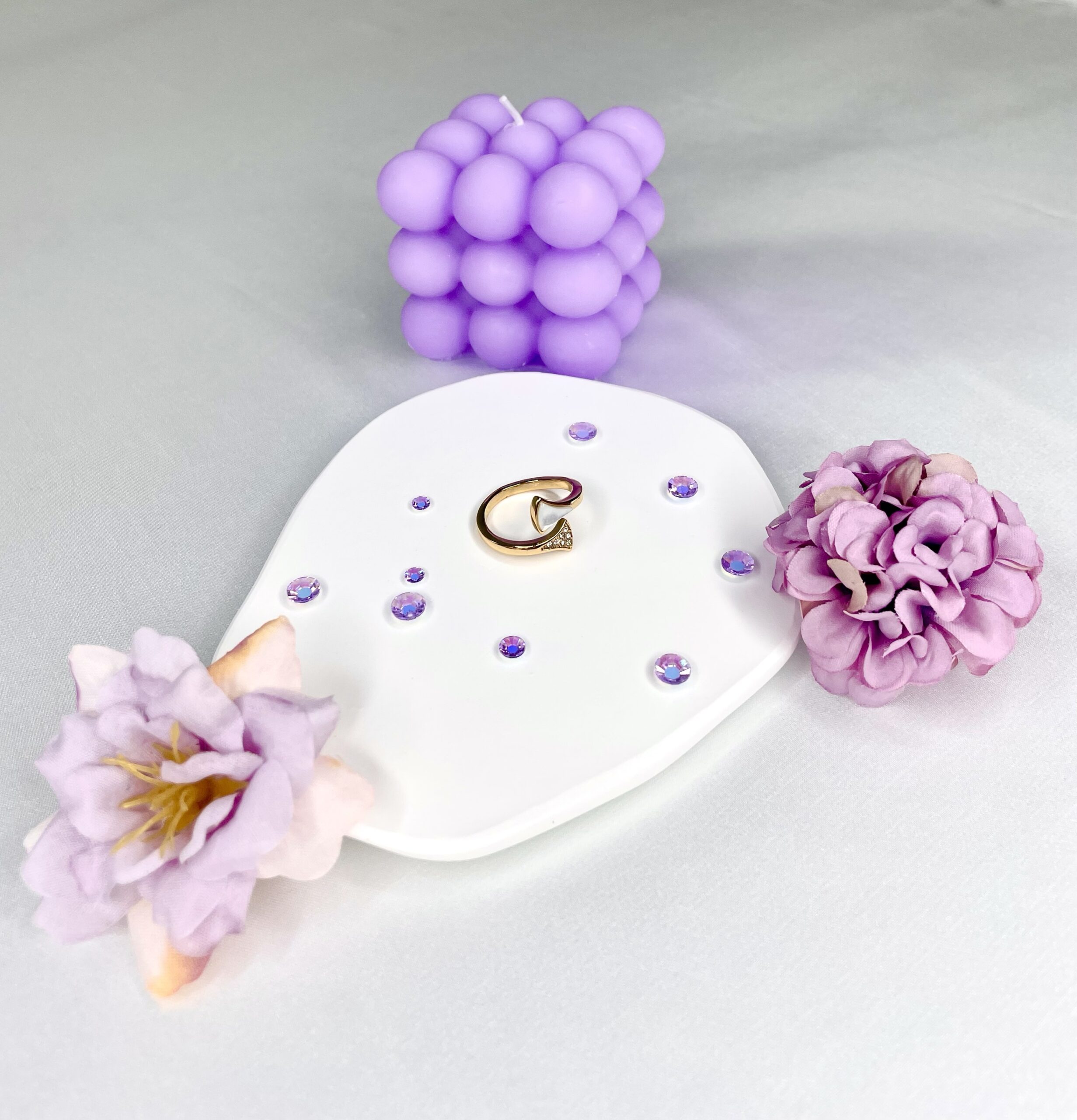 Bague ajustable croisée avec des strass d’un côté et une pierre de nacre de l’autre.