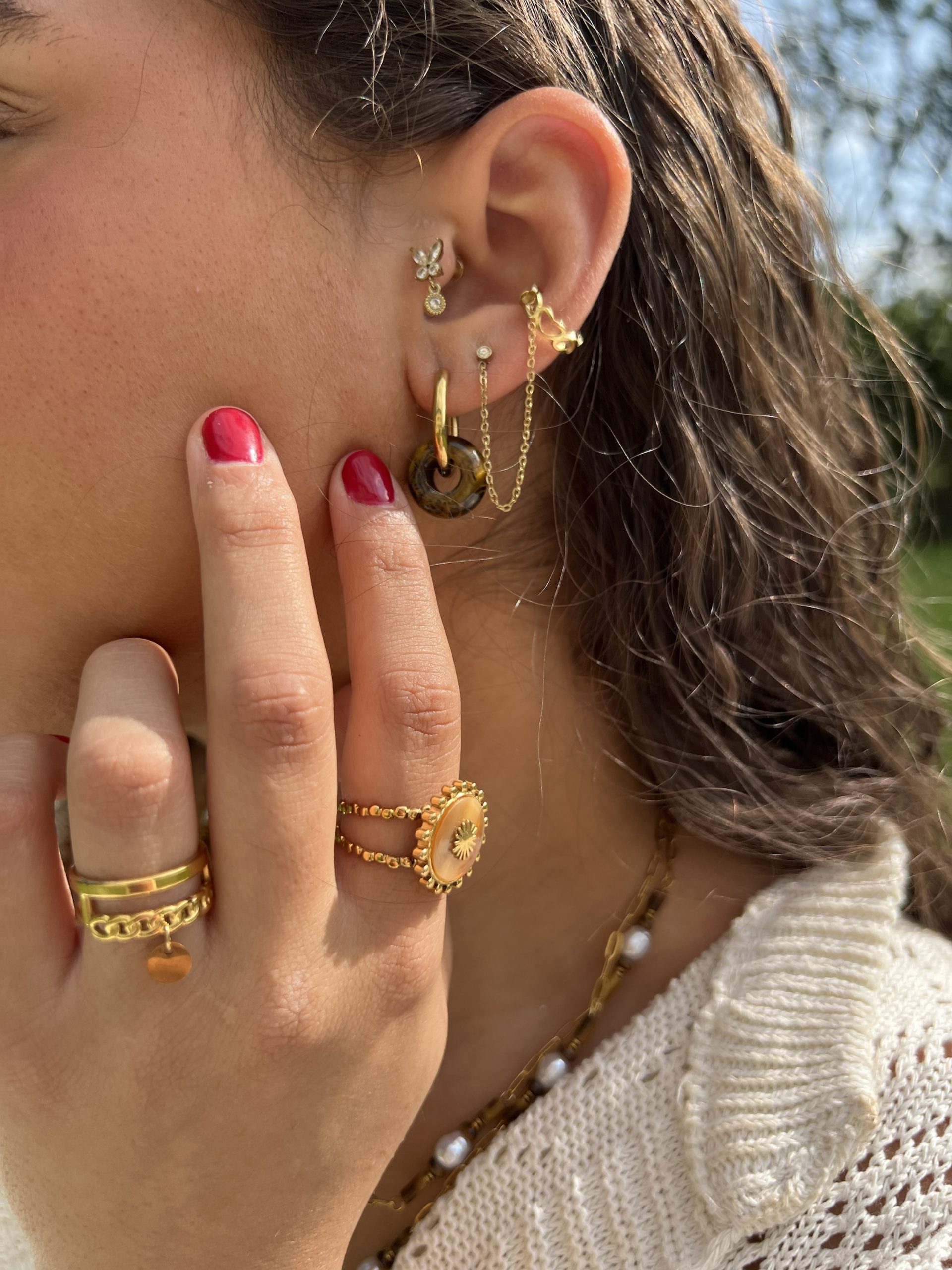 Petites créoles avec feuille dorée et pierre naturelle suspendues à chaque boucle.