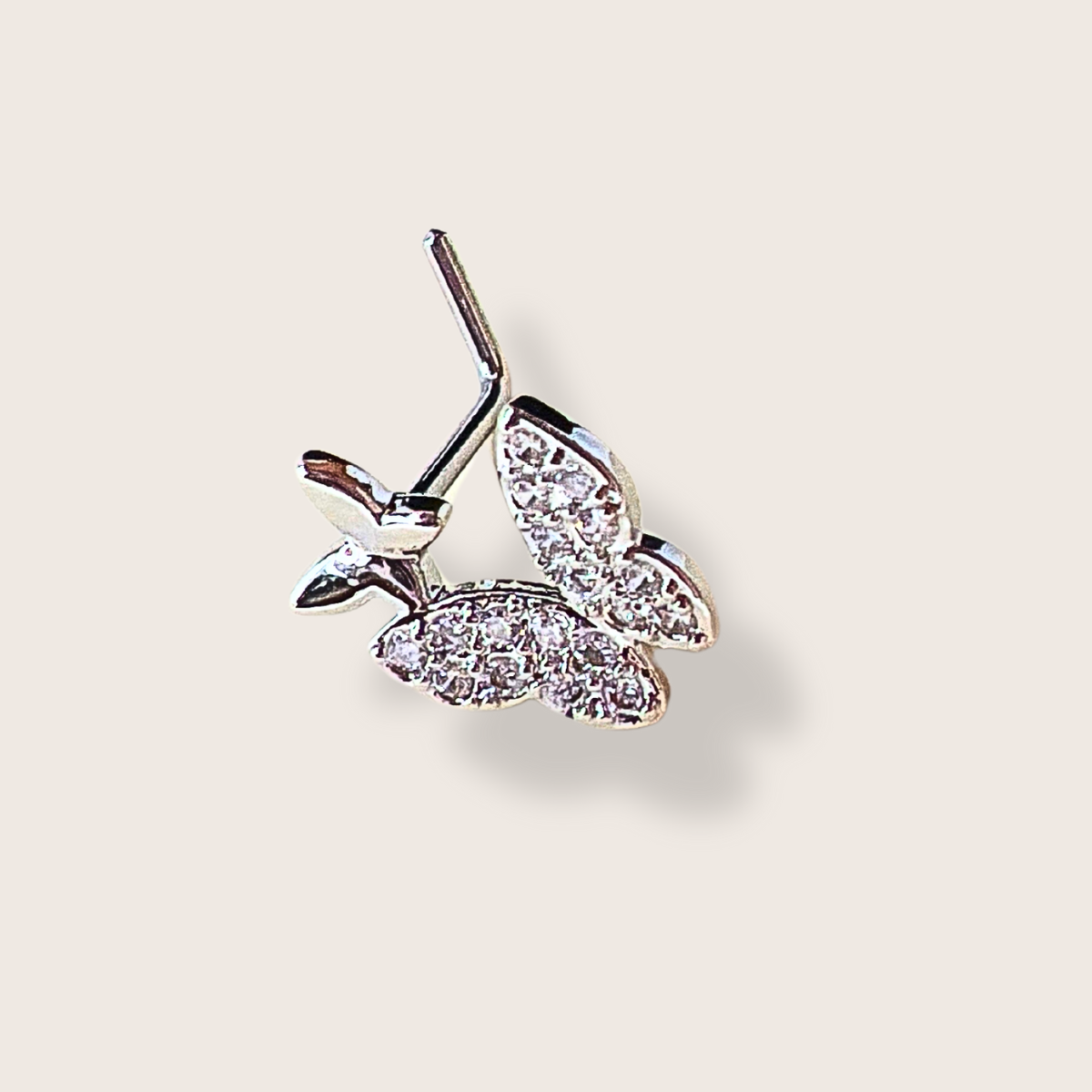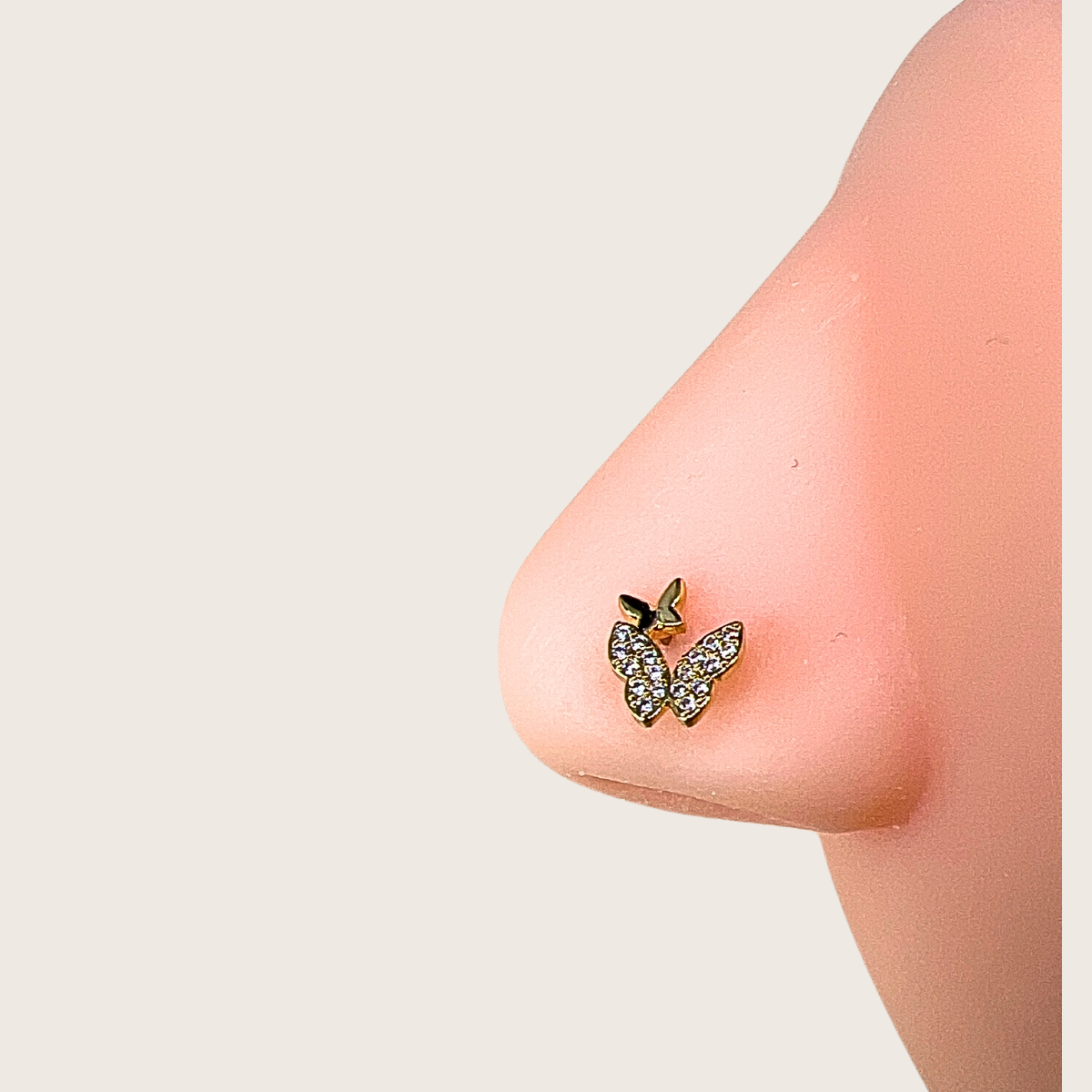 Piercing de nez orné de deux papillons délicats, un plus grand à strass et un plus petit, pour un effet harmonieux et poétique tout en finesse.