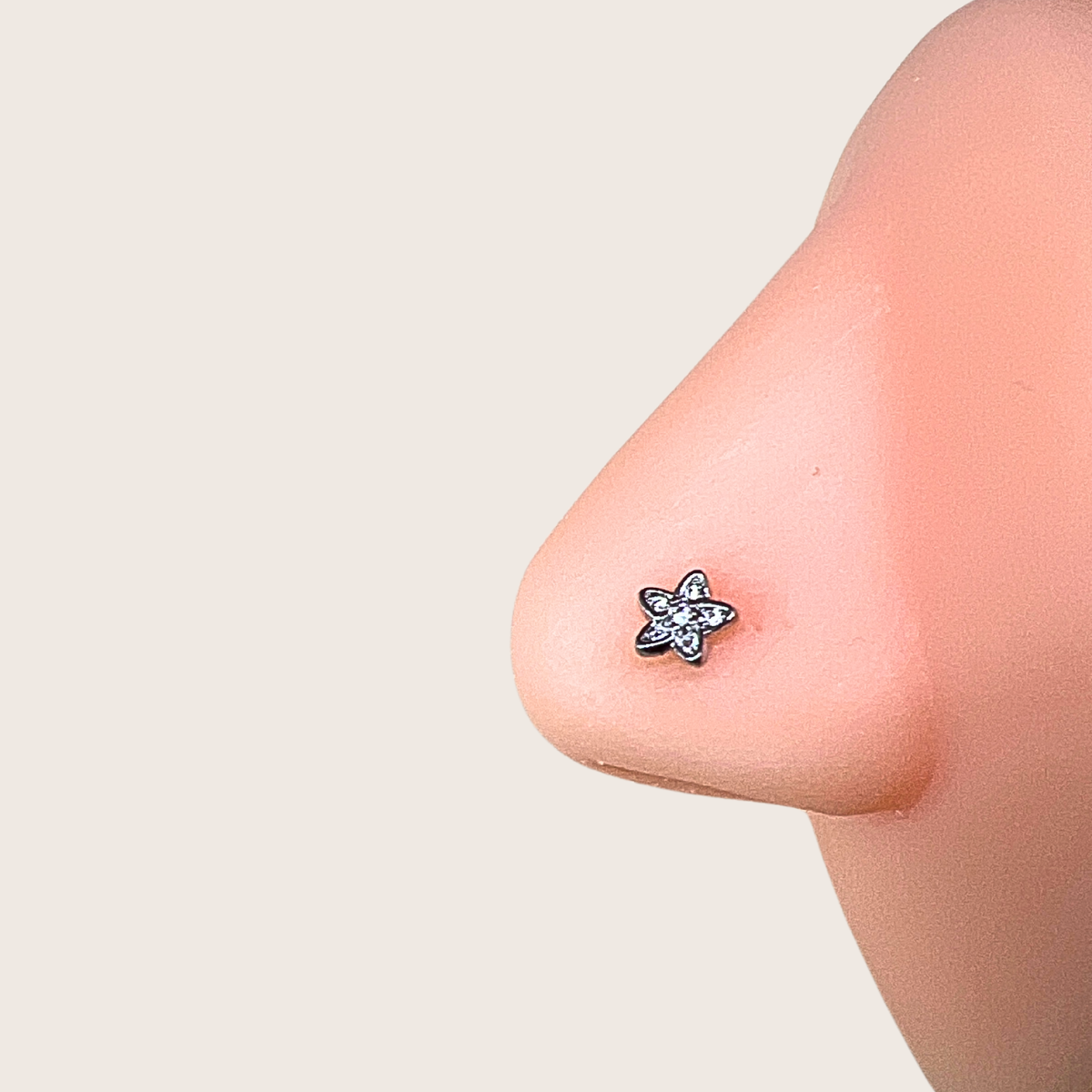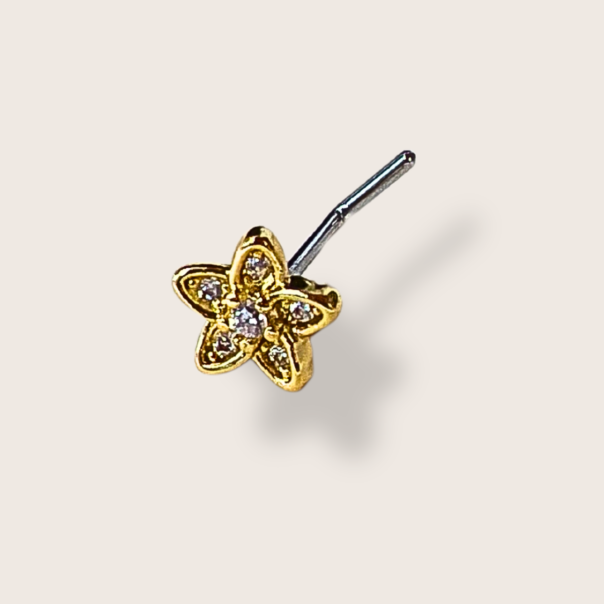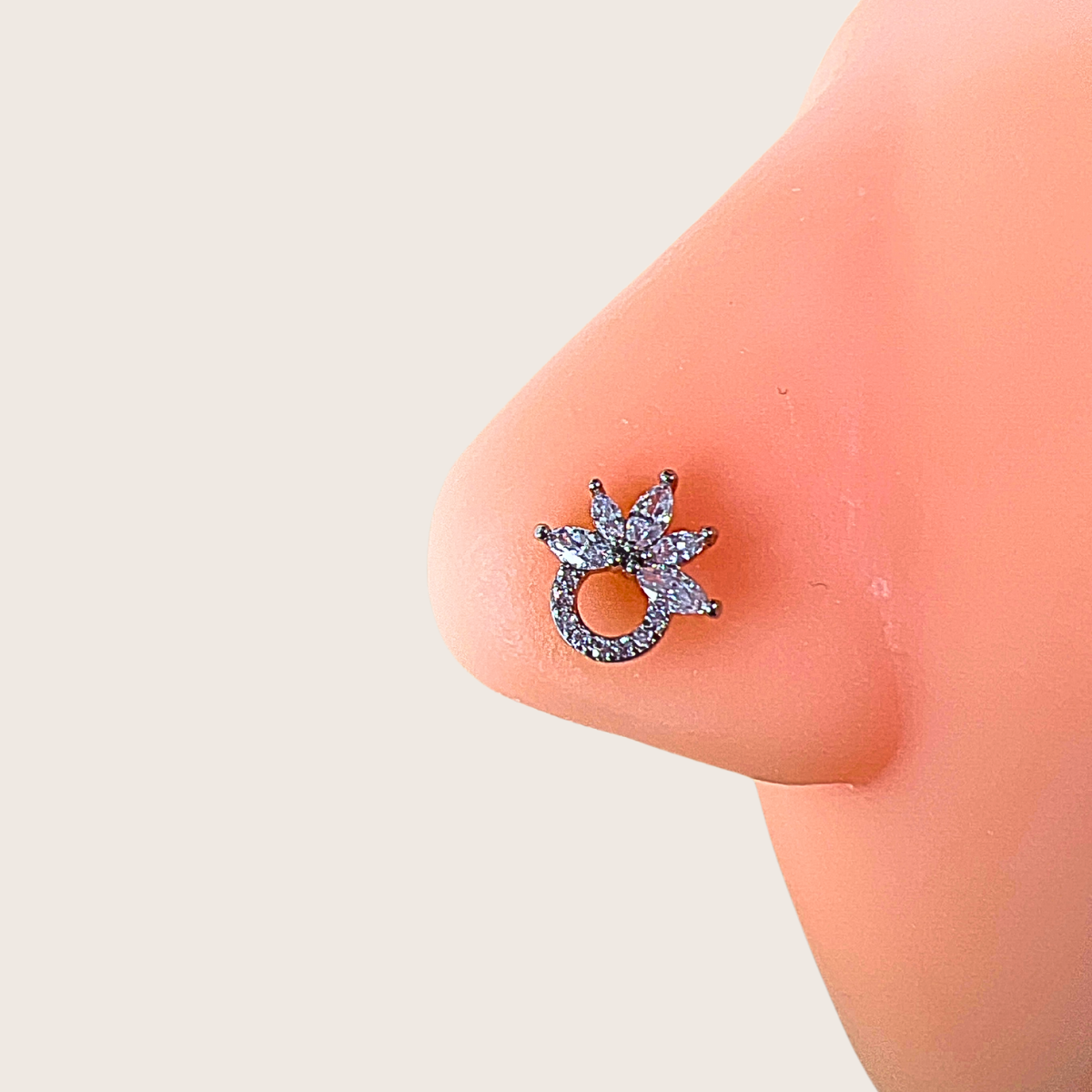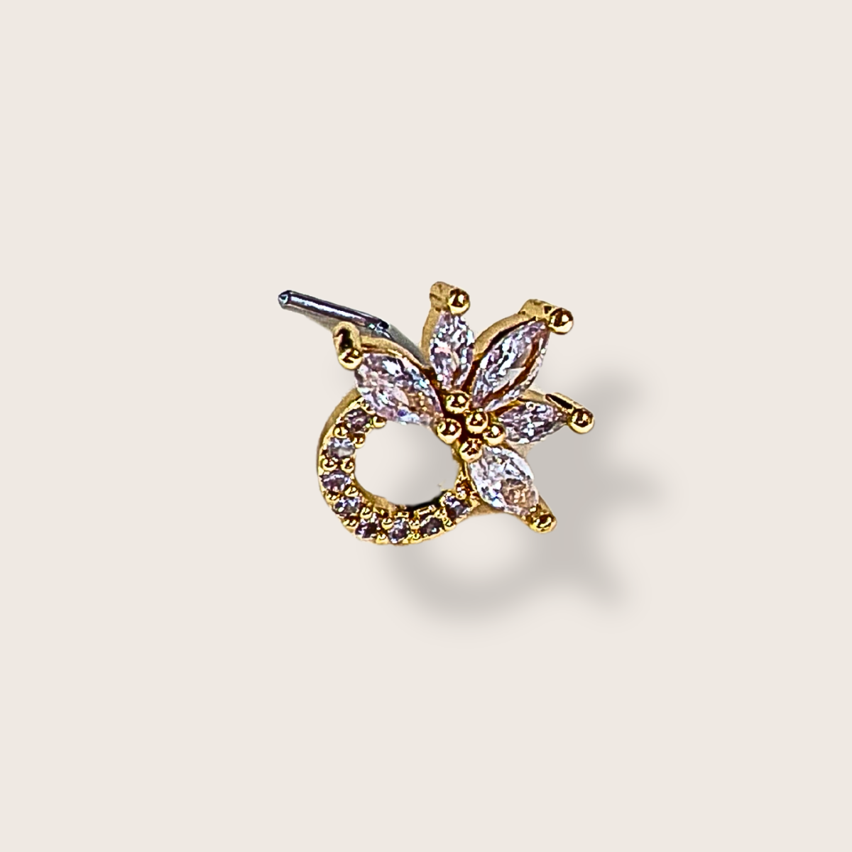 Piercing fin orné d’une petite fleur délicate, idéal pour apporter une touche de douceur et de féminité en toute subtilité.