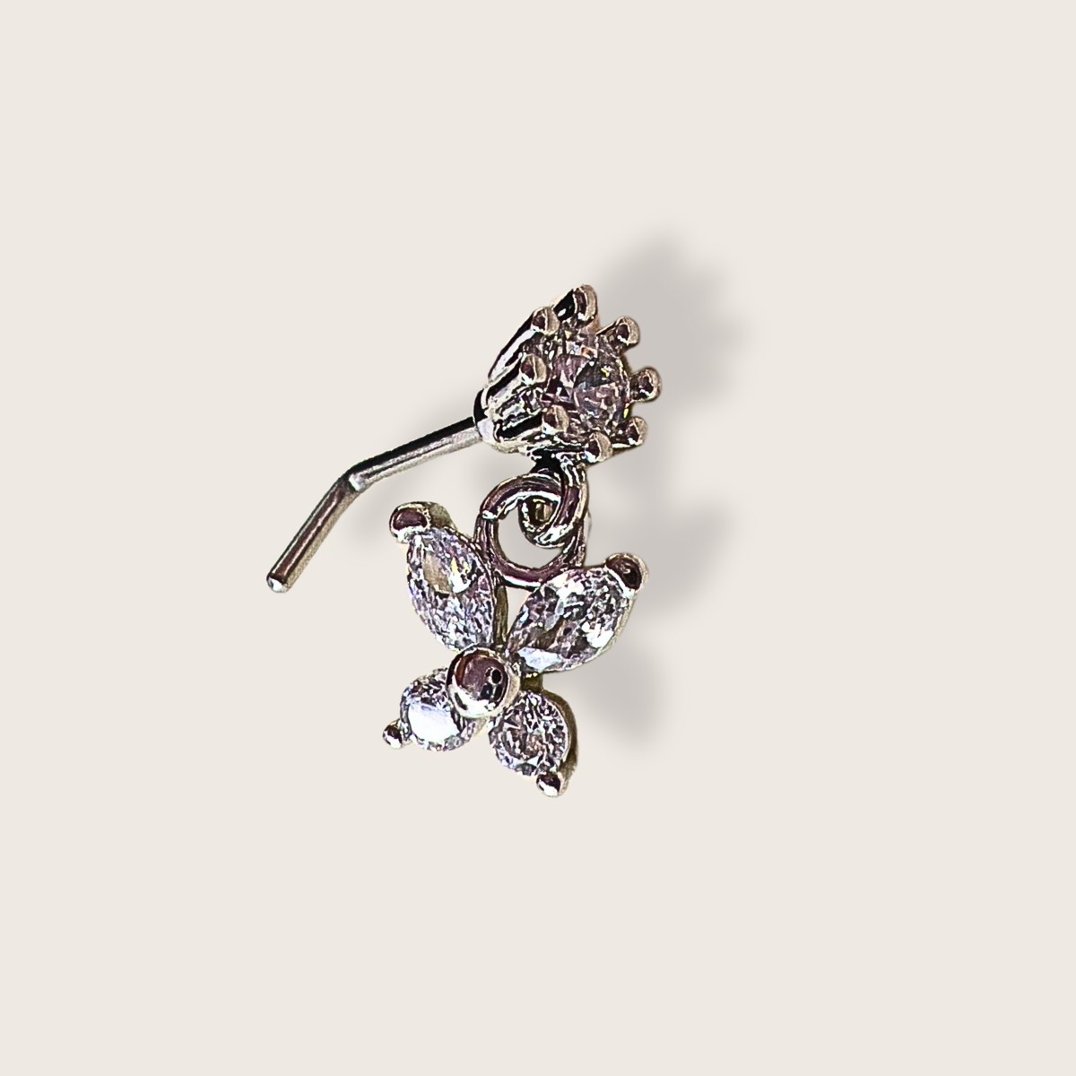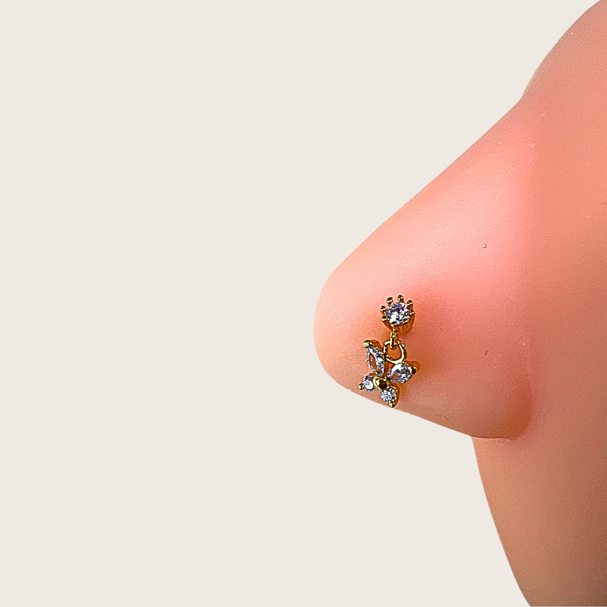 Piercing orné d’un strass scintillant, accompagné d’un petit papillon suspendu qui apporte une touche de légèreté et de délicatesse.