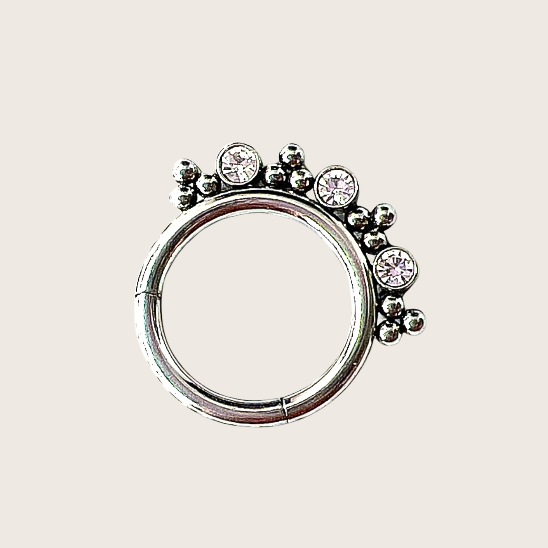Piercing anneau orné de petites perles formant des mini pyramides, sublimé par des strass brillants et des symboles à plat pour un look audacieux et stylé. Idéal pour sublimer le smiley, le daith, le septum, selon vos envies.