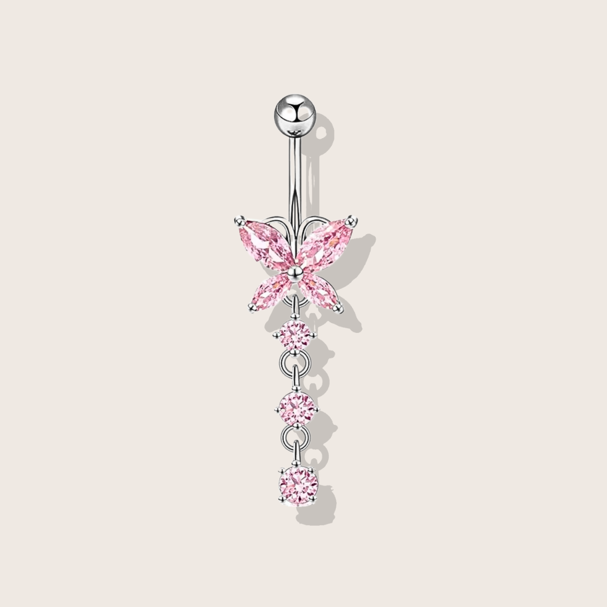 Piercing de nombril avec un papillon délicat en strass, accompagné de trois strass suspendus en dessous, créant un effet lumineux et élégant.
