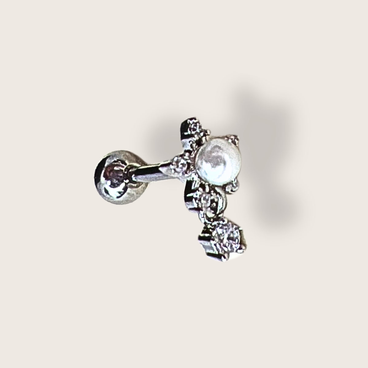 Piercing fin en forme de petite fleur, avec une perle en son centre et un pendentif discret qui apporte une touche de douceur et d’élégance à l’oreille.
