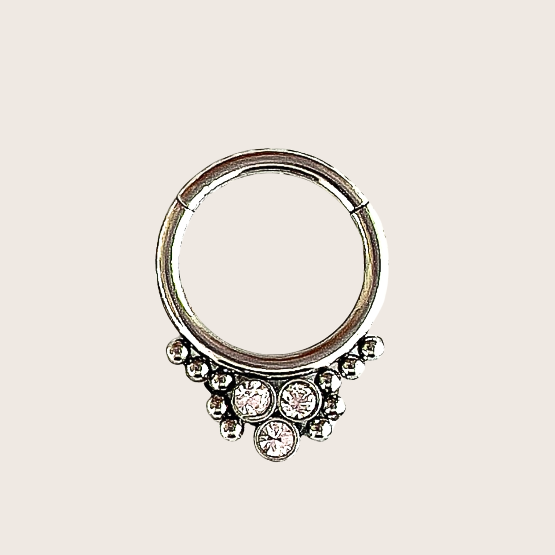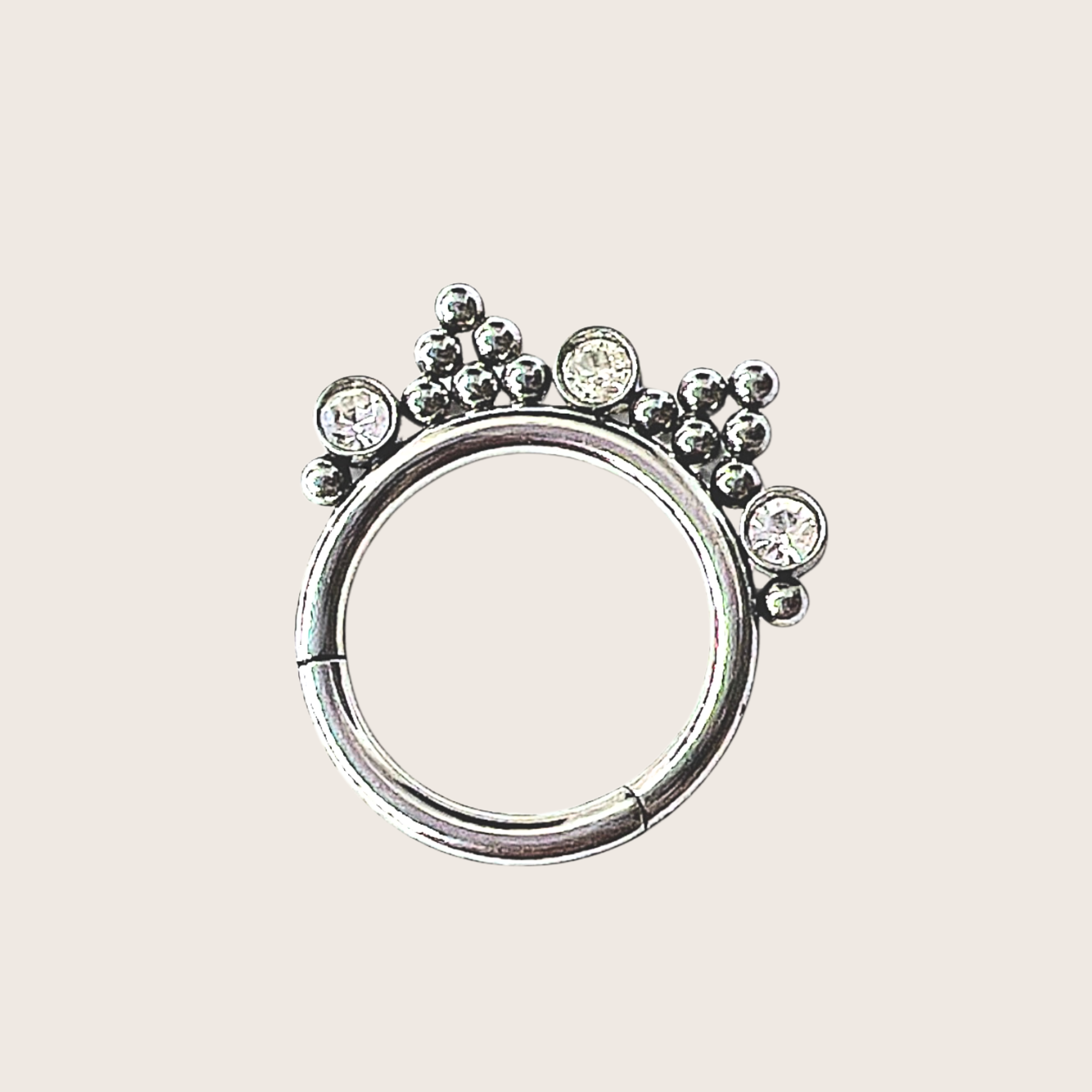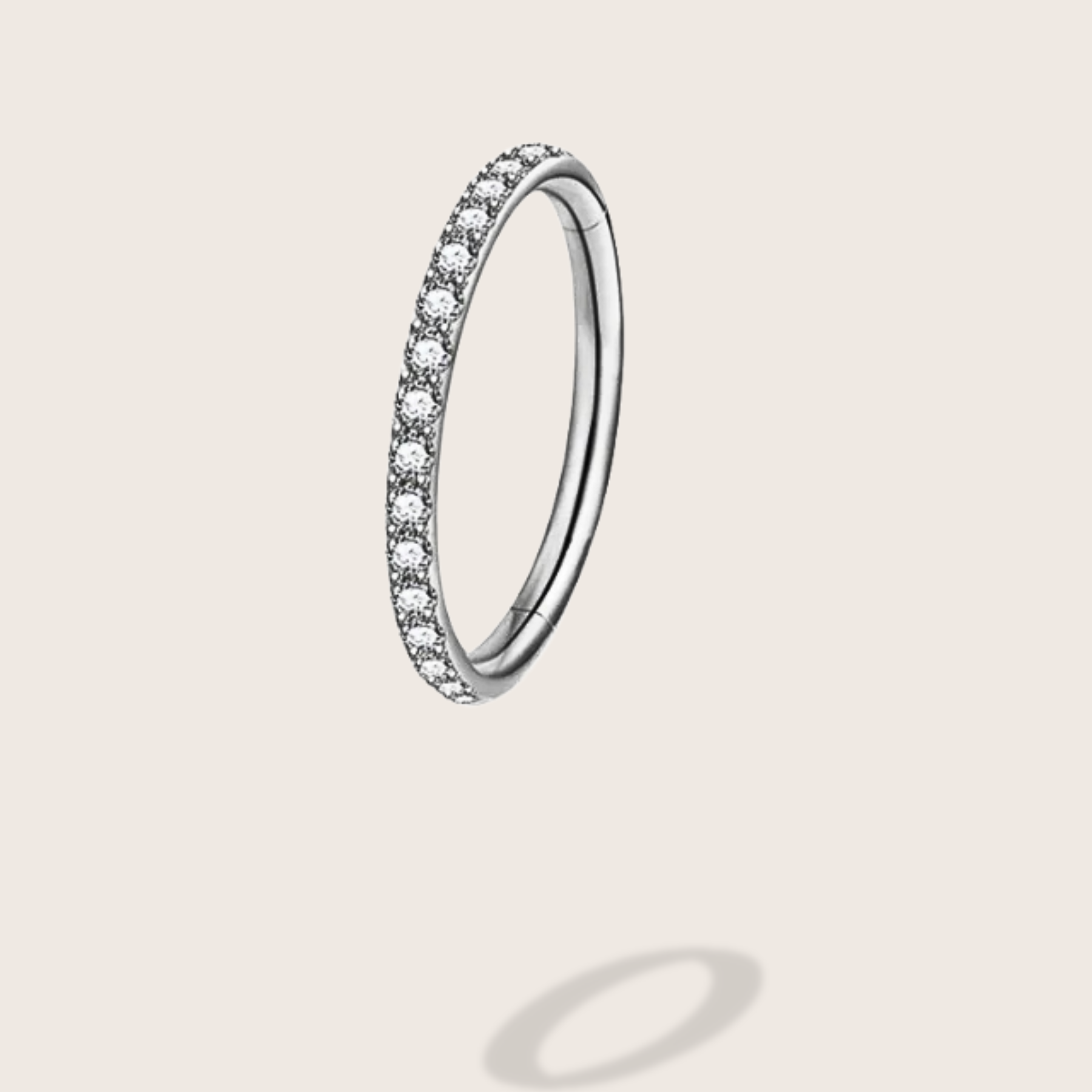 Piercing anneau serti de strass, disponible en 8 mm ou 12 mm. Le 8 mm est idéal pour l’hélix, le tragus ou le nostril. Le 12 mm convient parfaitement au conch et au septum. Un bijou lumineux, pensé pour sublimer chaque emplacement avec éclat.