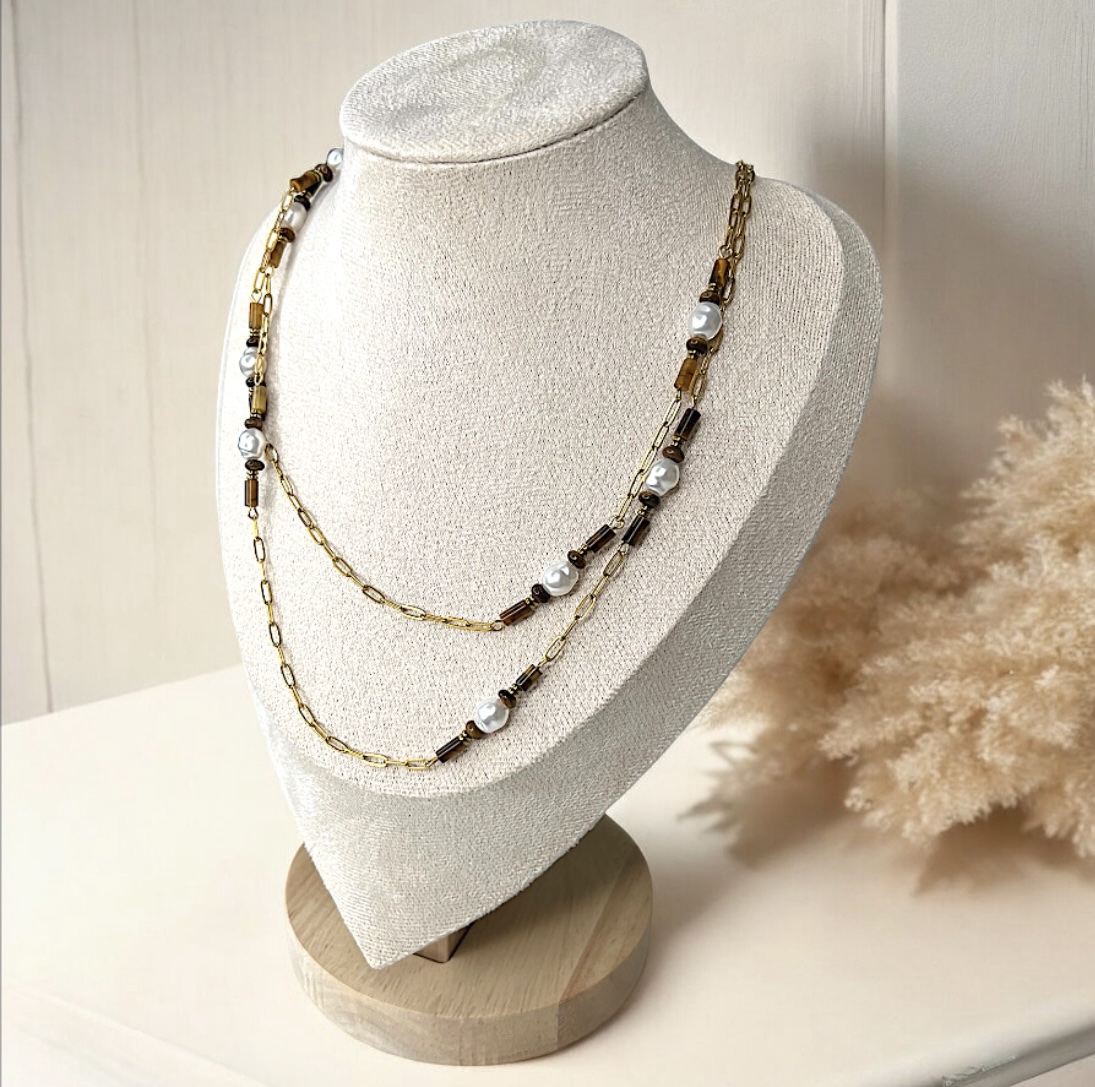 Collier double chaîne doré, sublimé de pierres naturelles soigneusement disposées pour un look à la fois délicat et affirmé. Idéal pour superposer avec élégance.