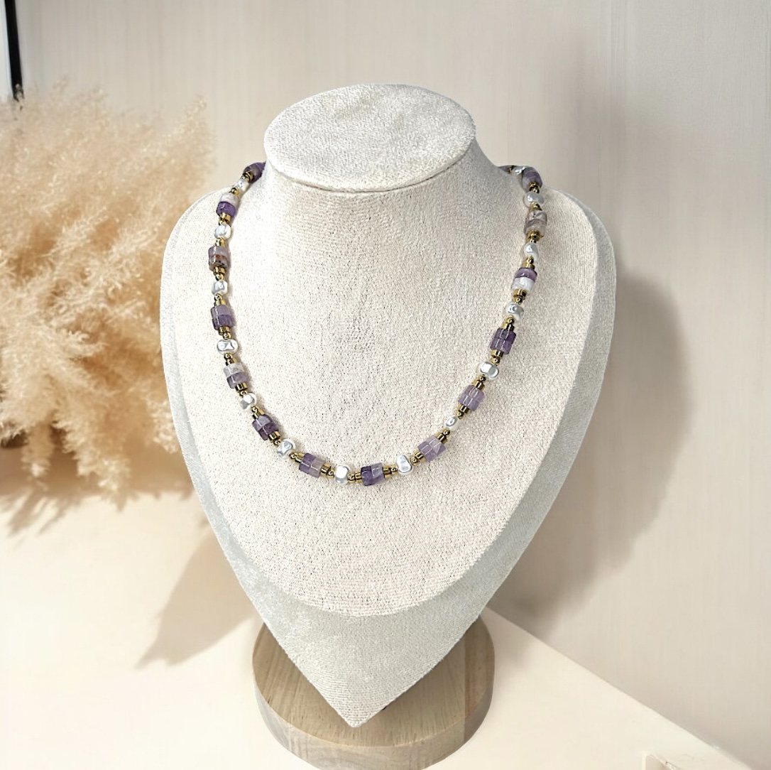 Collier lumineux alliant perles artificielles et pierres naturelles aux reflets violets. Un bijou délicat et envoûtant, entre douceur et mystère.