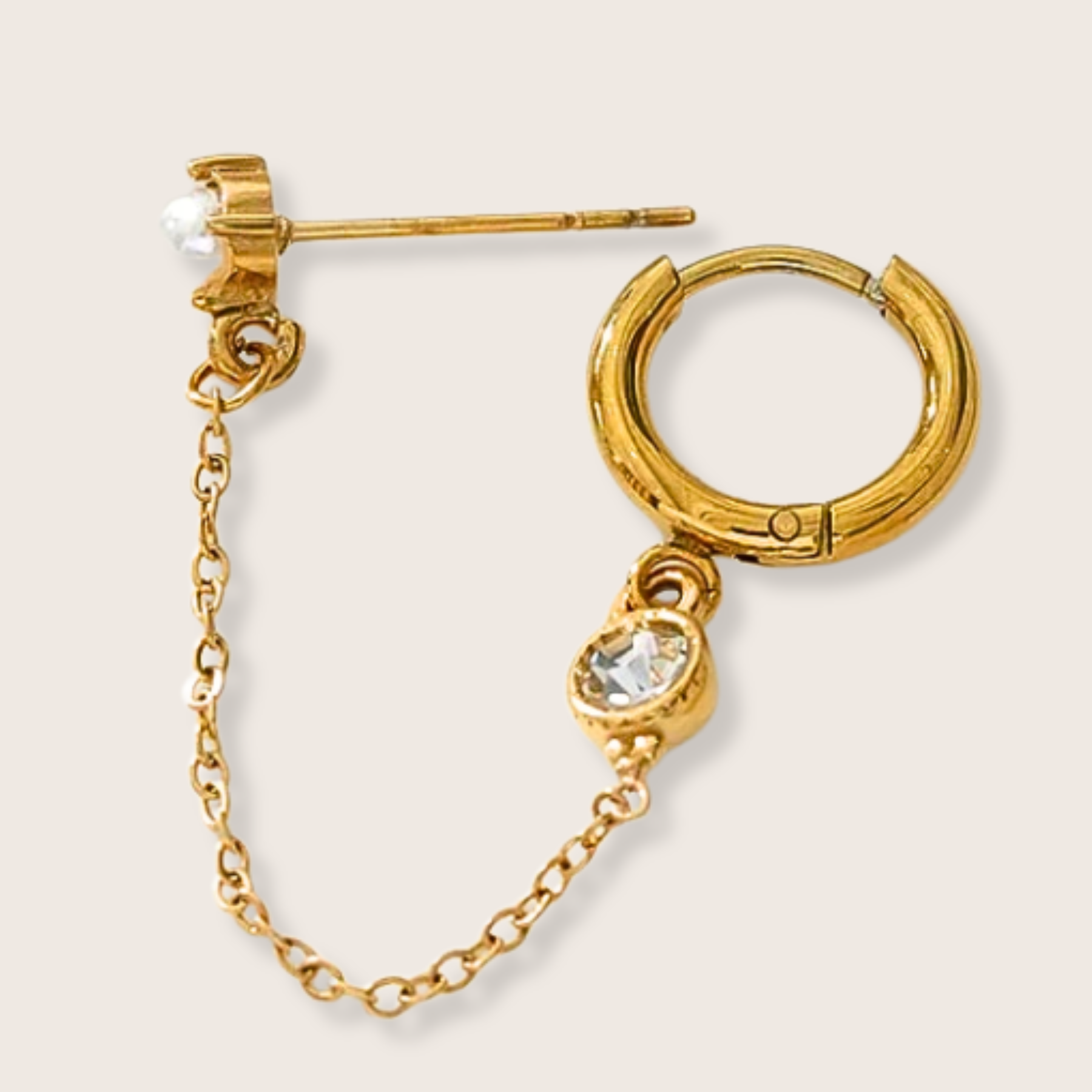 Boucle d’oreille à l’unité composée d’un anneau et d’un strass, reliés par une fine chaîne. Un design original qui habille l’oreille avec style, en jouant sur deux trous.