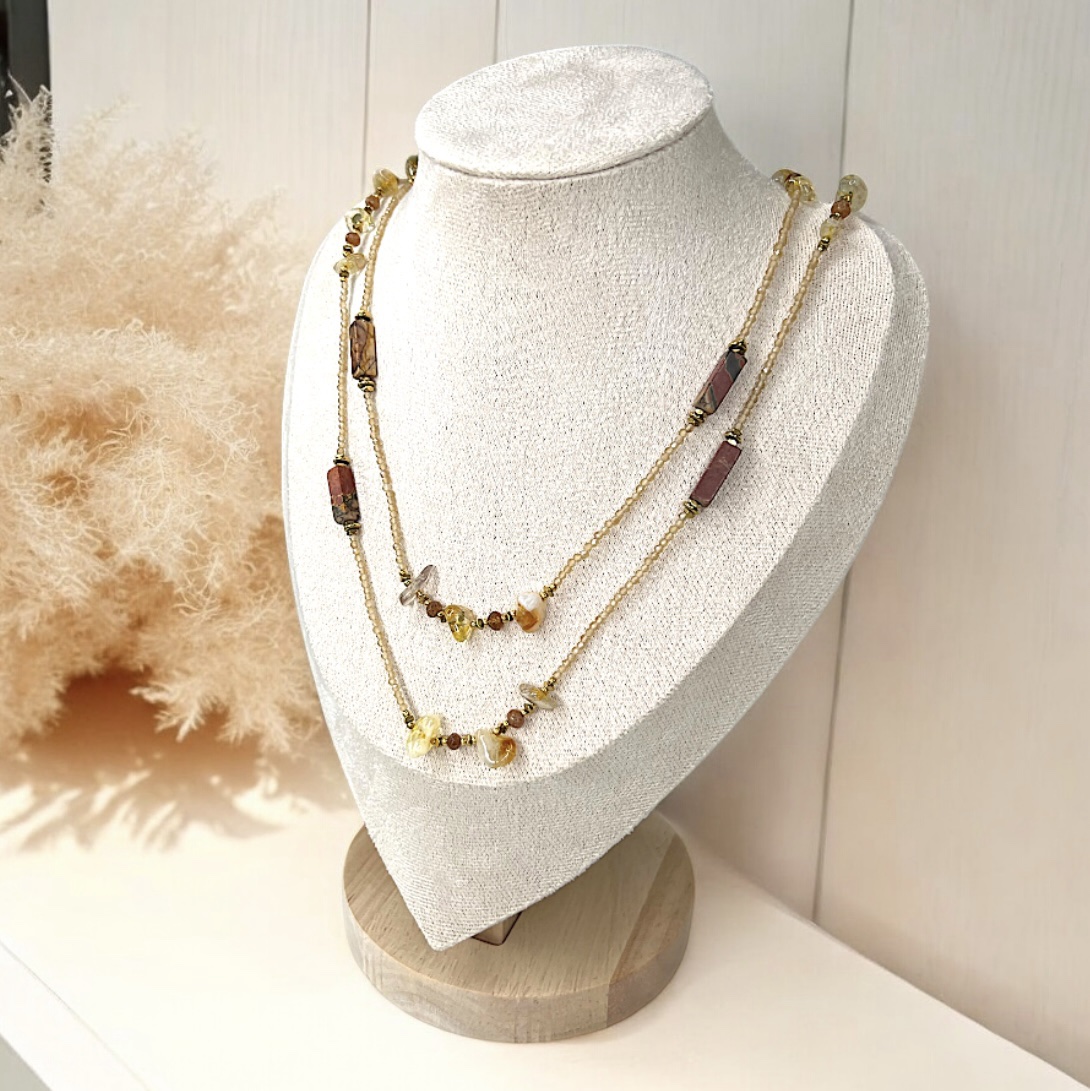 Collier à double chaîne mêlant éclats de cristal artificiel et pierre naturelle. Une création lumineuse qui équilibre élégance moderne et énergie minérale.