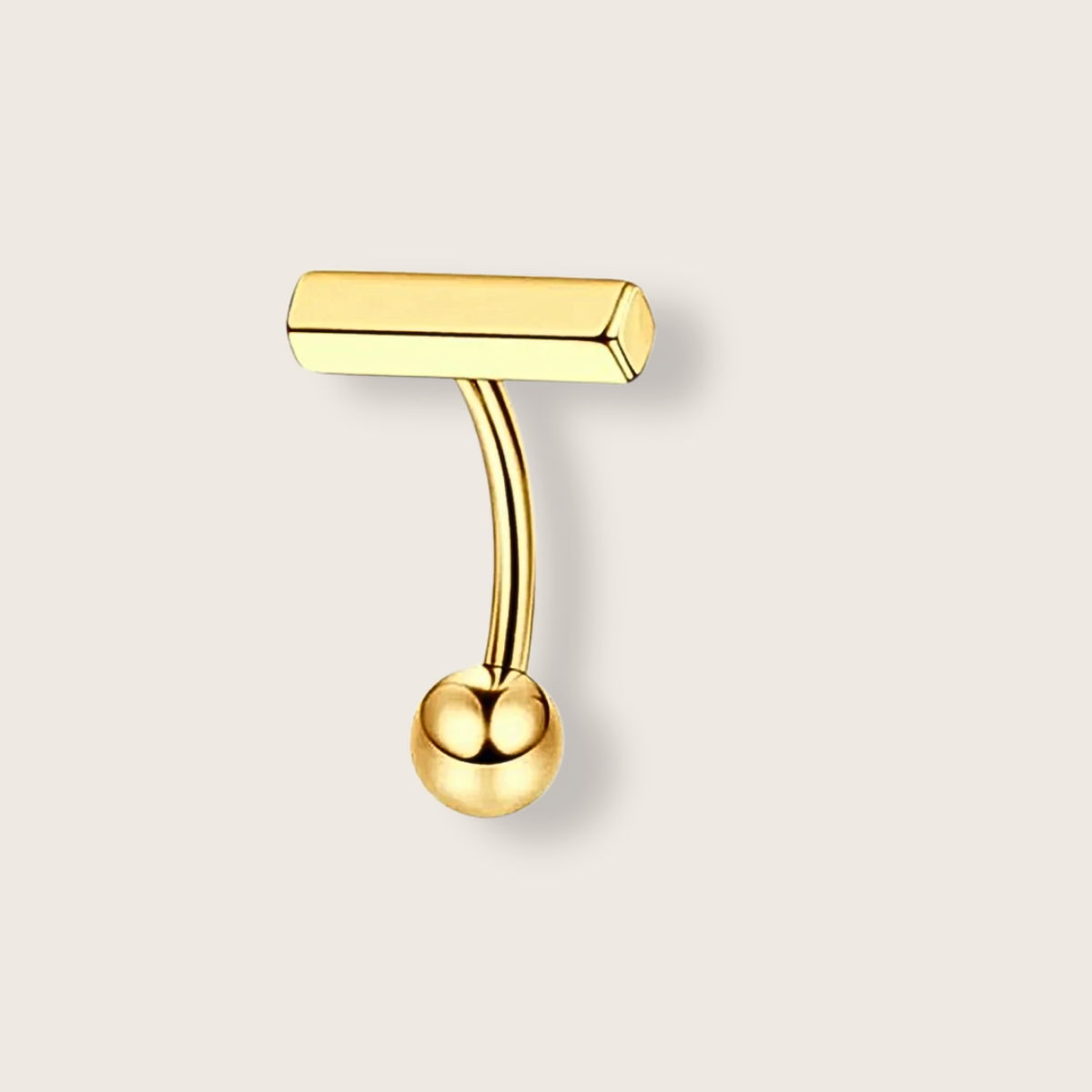 Piercing de nombril au design simple et épuré, avec une barre horizontale sur le dessus pour un style original et minimaliste.