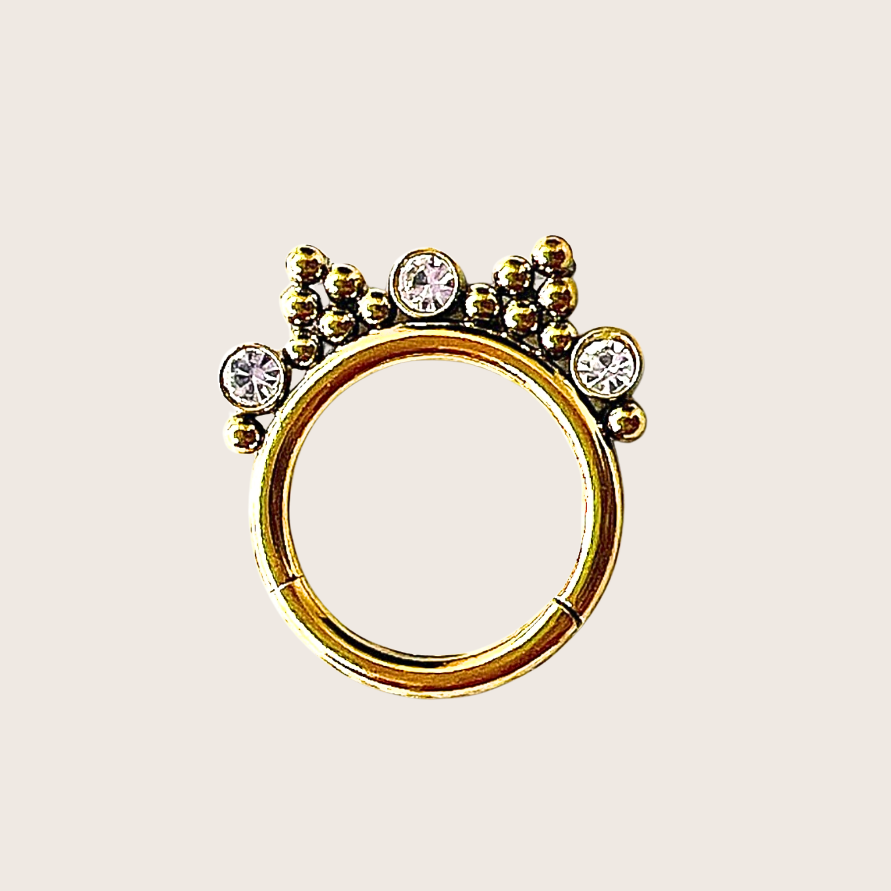 Piercing anneau orné de petites perles formant des pyramides, sublimé par des strass brillants et des symboles à plat pour un look audacieux et stylé. Idéal pour sublimer le smiley, le daith, le septum selon vos envies.